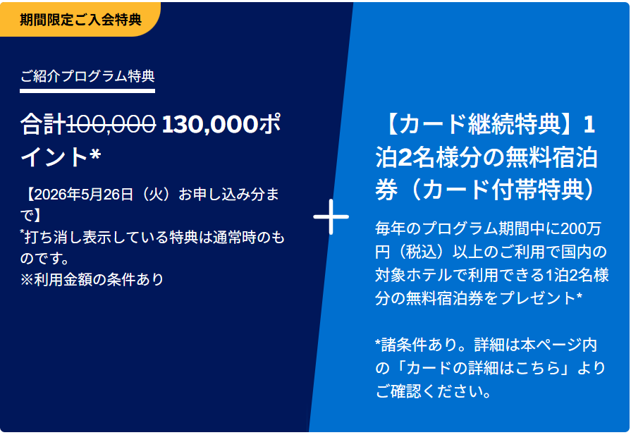 毎年カード継続特典として、国内対象ホテルの 1泊2名分の無料宿泊券を獲得できる特典のことを言います。