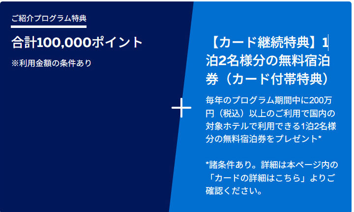 毎年カード継続特典として、国内対象ホテルの 1泊2名分の無料宿泊券を獲得できる特典のことを言います。