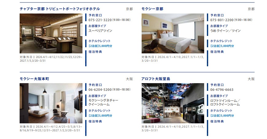 対象となるホテルは1泊4~5万円ほどするホテルが多く、プラチナではカードを持っているだけで付いてくる特典です。