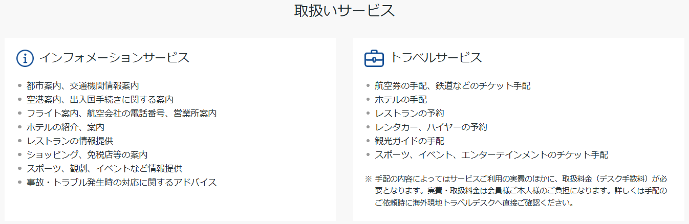 取扱いサービスは、以下の表のとおり、「インフォメーションサービス」と「トラベルサービス」の大きく2種類あり、