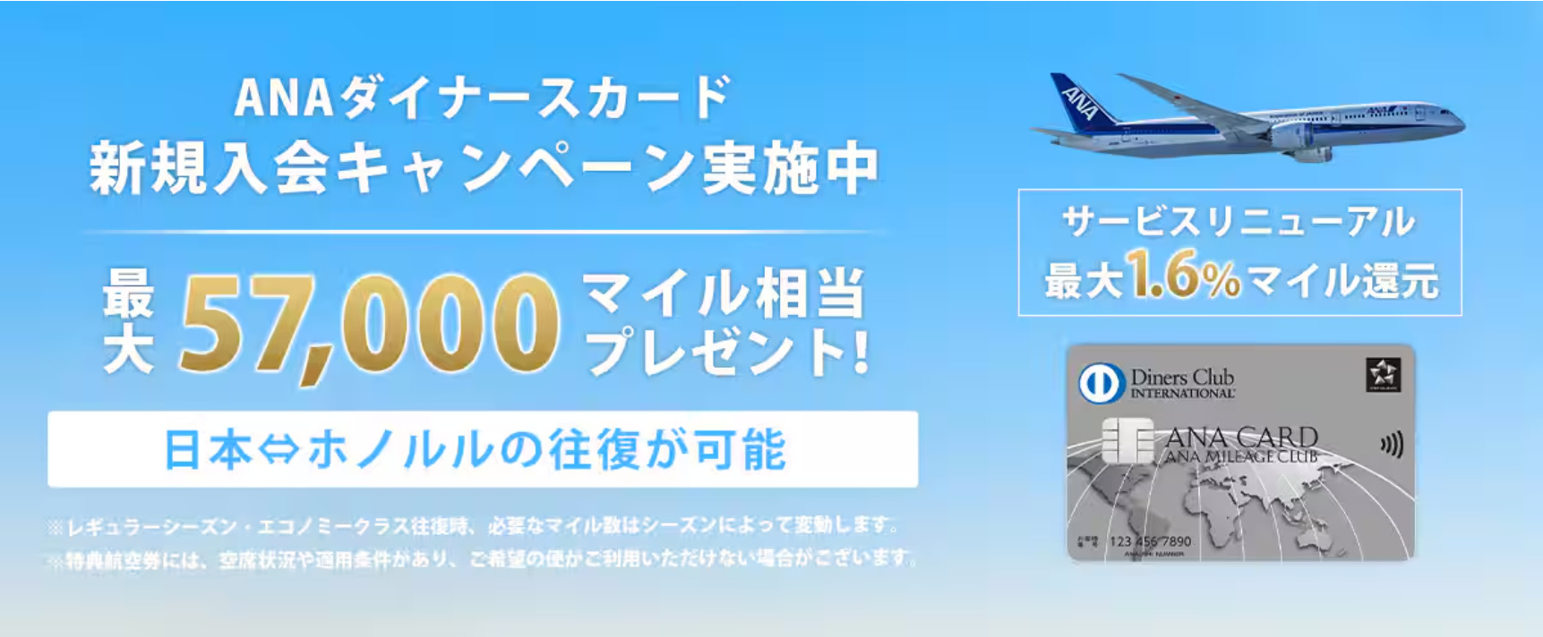 「ANAダイナースカード」を発行する場合は、2000マイル を獲得することが出来ます。