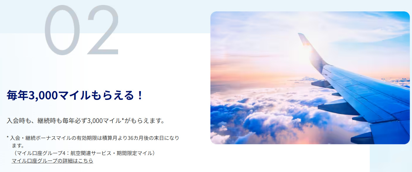 カードを毎年継続して保有するだけで、3000マイルの継続ボーナスがプレゼントされます。