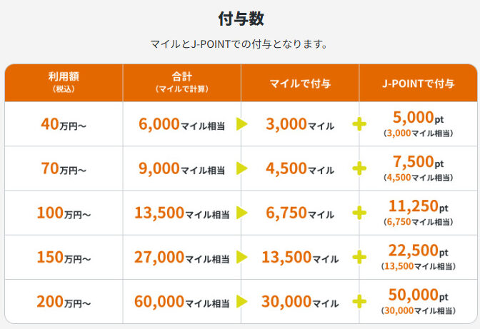 最後に「ANAJCBワイドゴールドカード」でショッピング利用し、以下のとおりカードの利用額に応じてマイルを獲得できます。