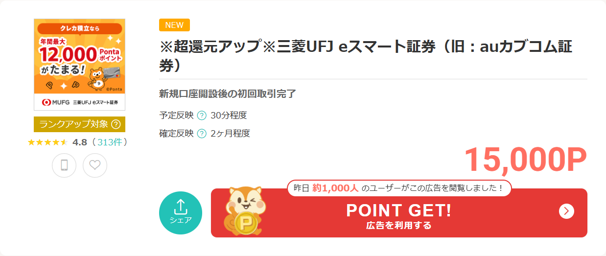 ポイントサイト経由で「三菱UFJeスマート証券」の口座を開設し、たった100円以上の取引をするだけで