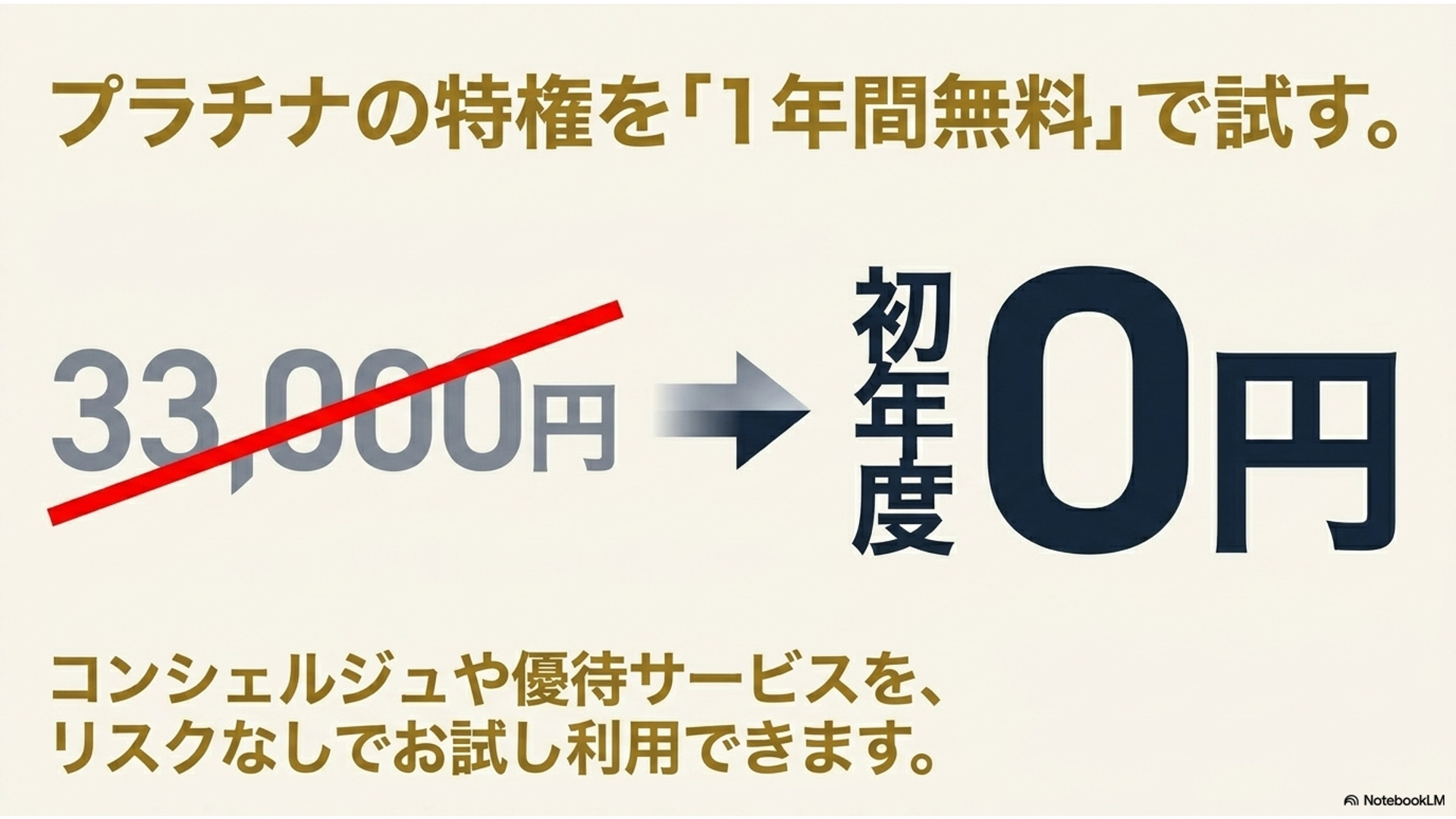 初めてプラチナカードを持つ方にとって、高額な年会費を払って後悔するリスクがないため、申し込みの心理的ハードルを極限まで下げてくれます。