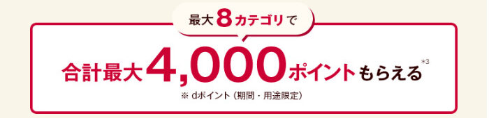 この特典は、入会月から5か月後末までに、8つの対象カテゴリーにおいて、「dカードゴールド」で支払う設定をし、初めて支払いをした場合、各カテゴリーごとで500pを貰え、