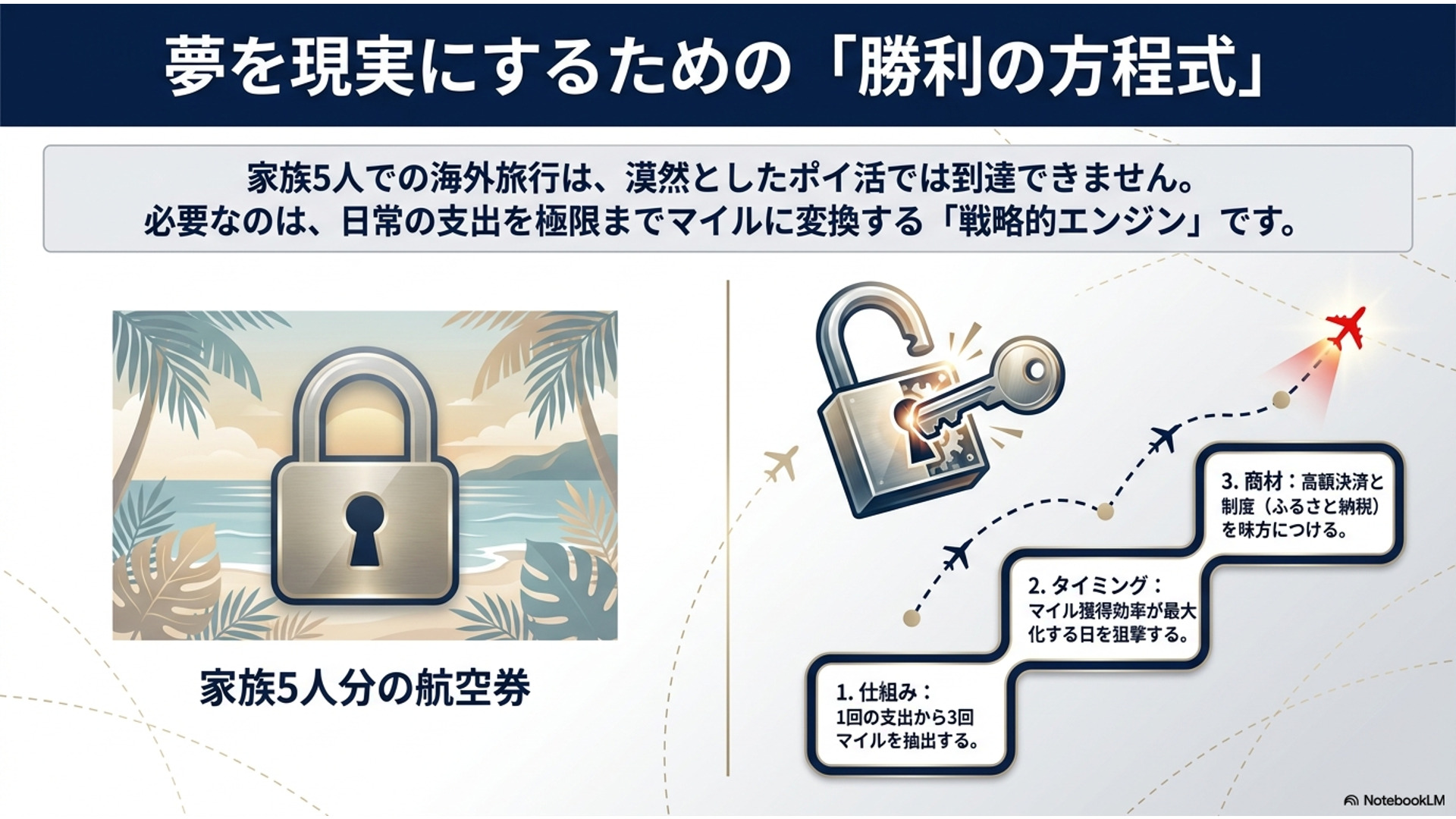私自身、5人の家族旅行の費用をいかに抑えるかを考える中で、特約店やお得なキャンペーンを利用して効率よくマイルを稼ぐ方法を模索してきました。