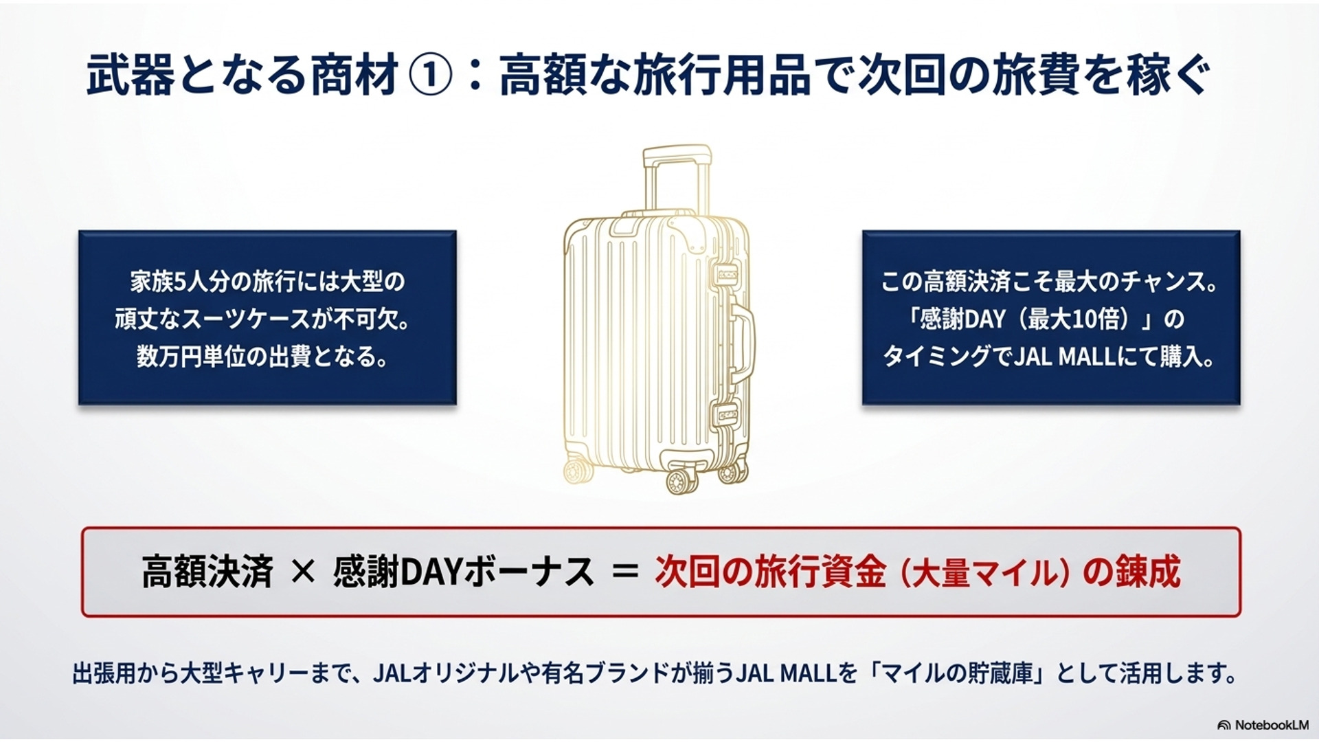 高額な旅行用品こそ、マイルの還元率が大幅に上がるタイミングでJAL MALLから購入し、次の旅行の資金へと変えていくのが賢い方法です。