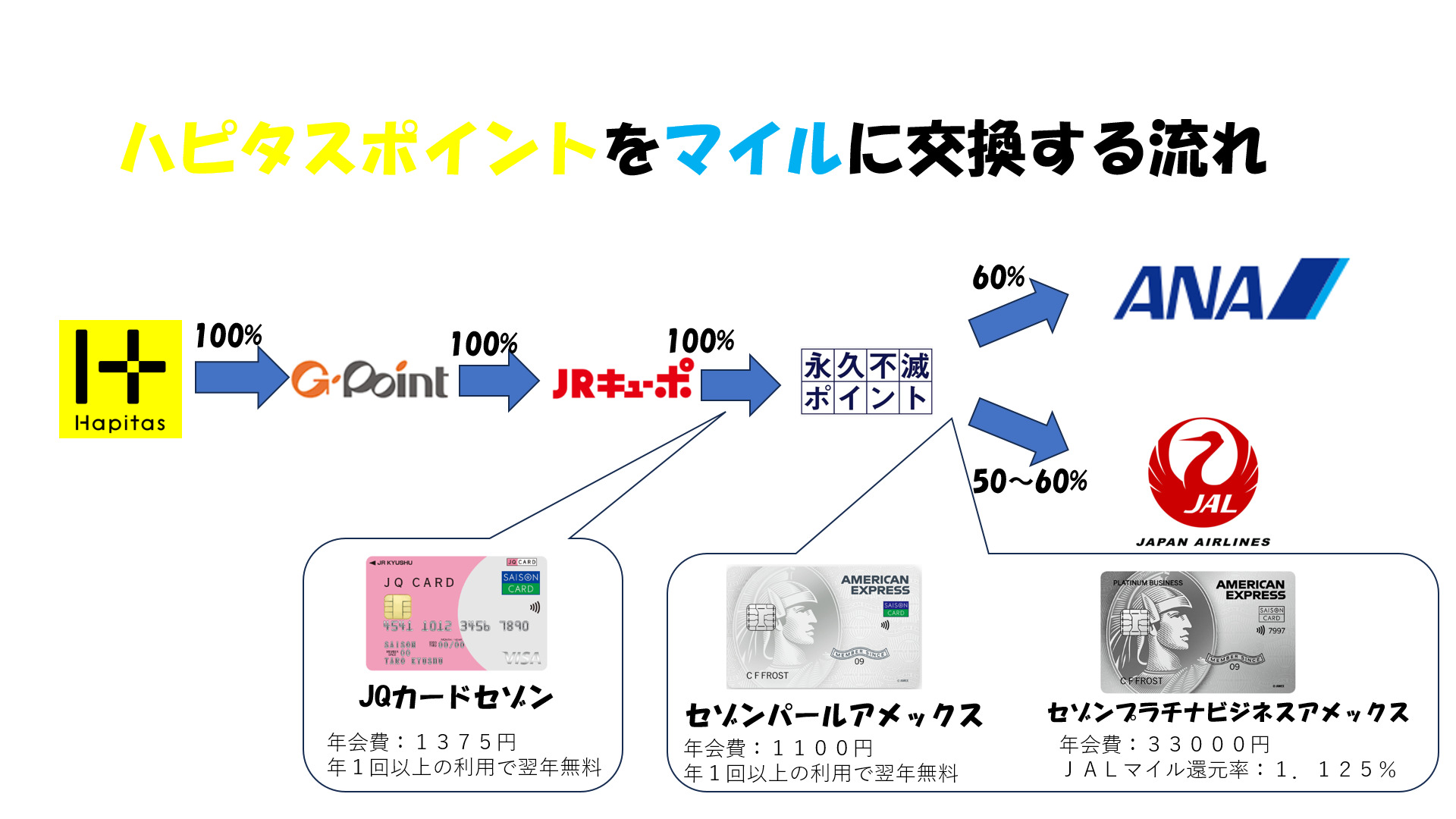 ハピタスポイントからマイルまでのお得な交換ルートは、以下のとおりとなっています。