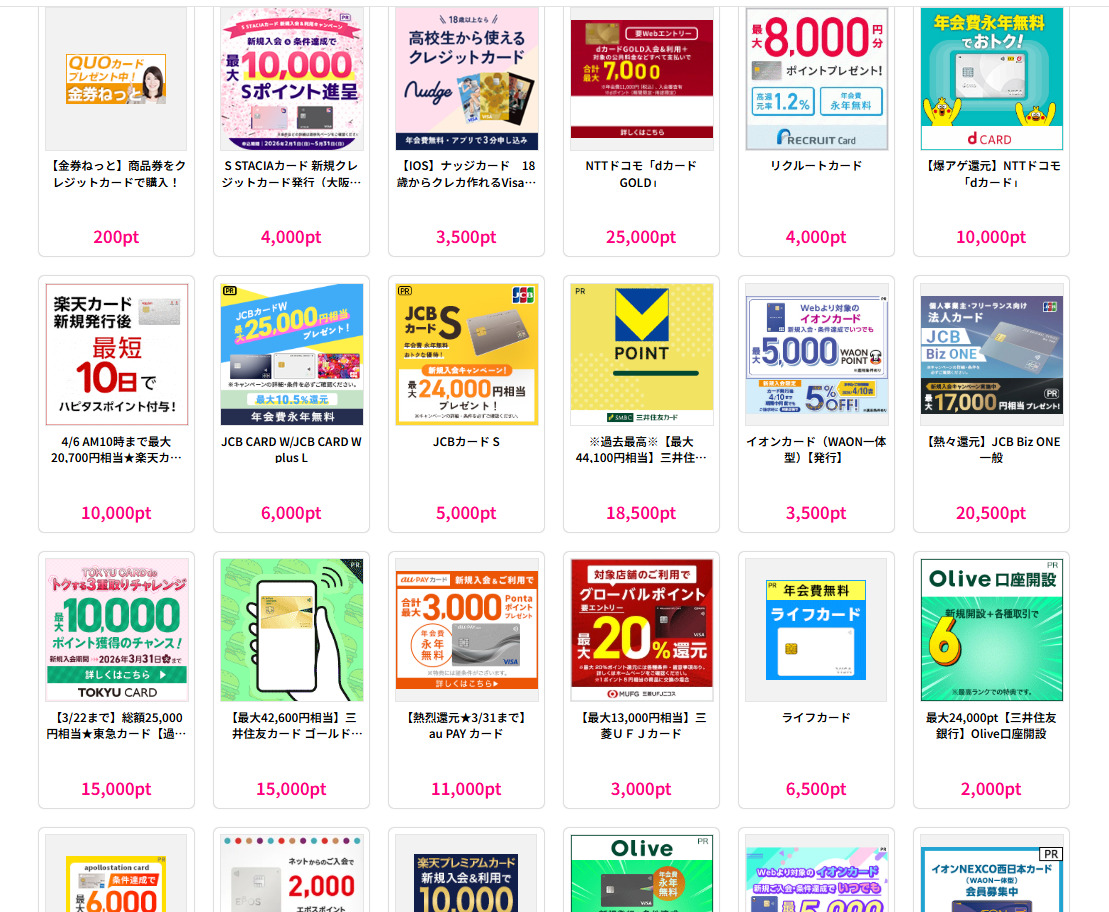 まとまったポイントを獲得しやすい代表例が、クレジットカード発行の案件です。