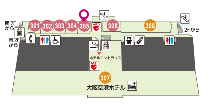 そして、伊丹空港の「大阪エアポートワイナリー」は、中央ターミナルの制限区域外の3Fに上がった上図の「305」の位置になります。