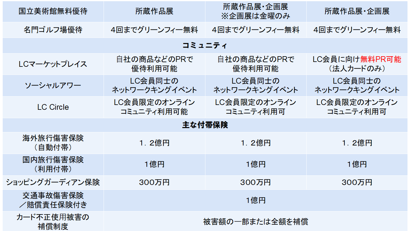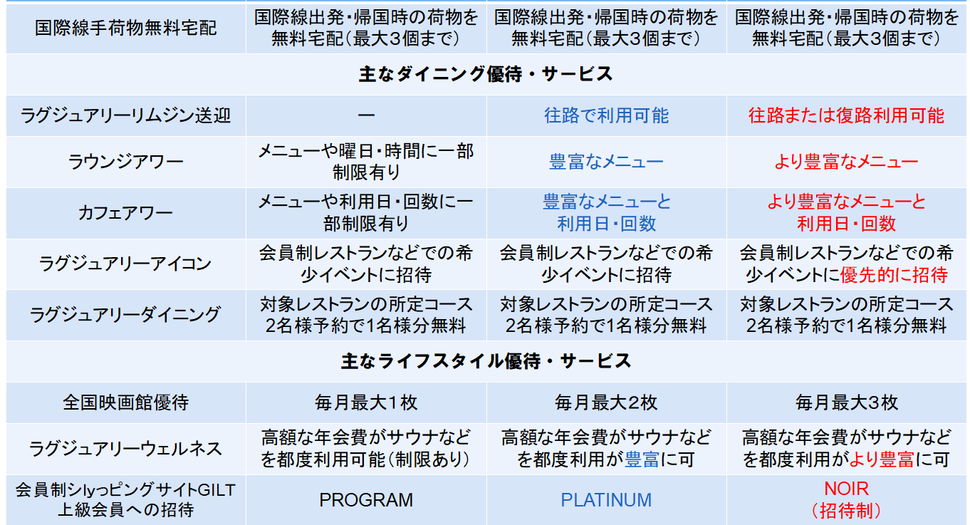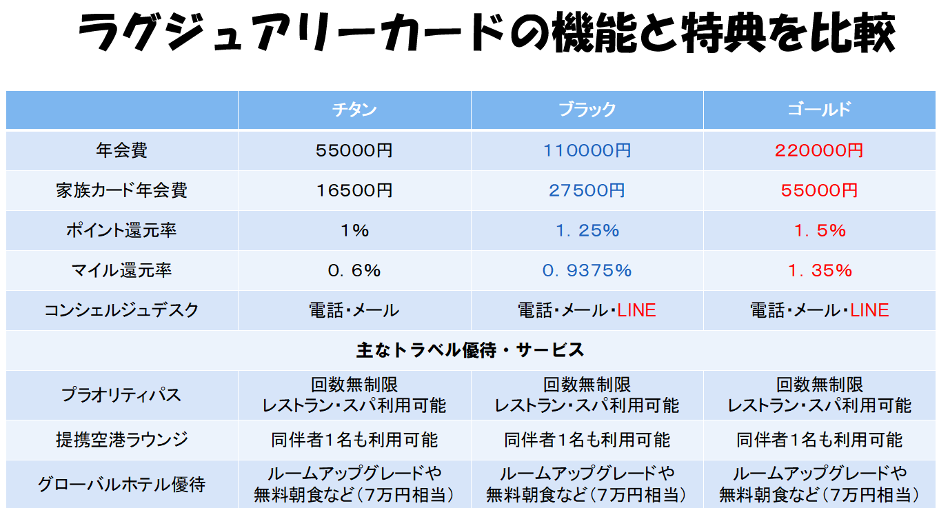 ラグジュアリーカードのゴールド/ブラック/チタンの3券種を比較すると上表のとおりで、