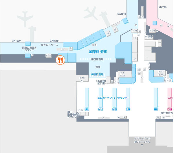 国際線ターミナルビル3Fの出入口審査ゲート隣(制限区域外)のエスカレーターを上がった4Fにあります。