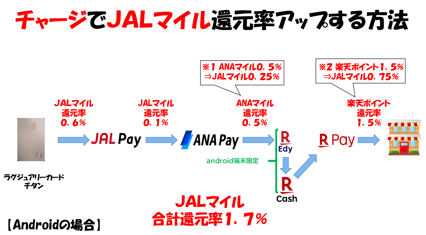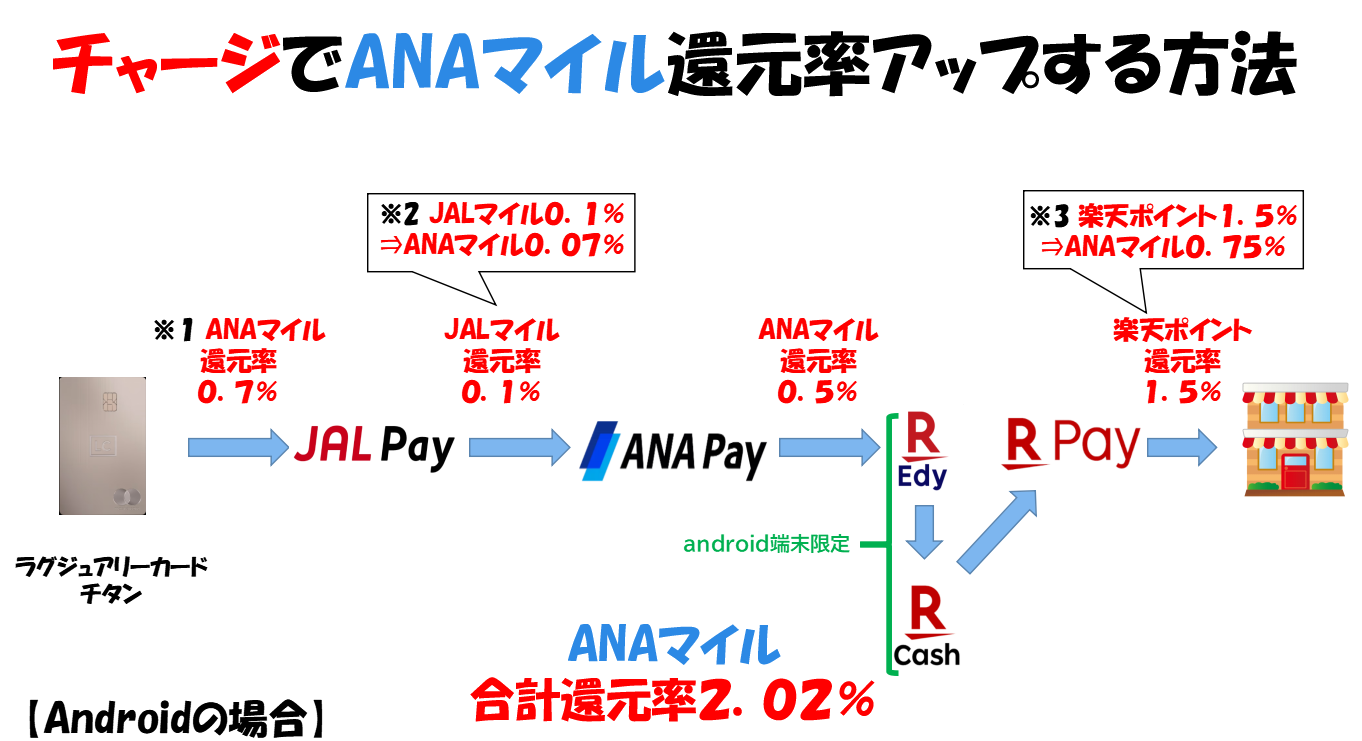 このチャージルートは、「ANAPay」から「楽天Edy」へのチャージ部分が、