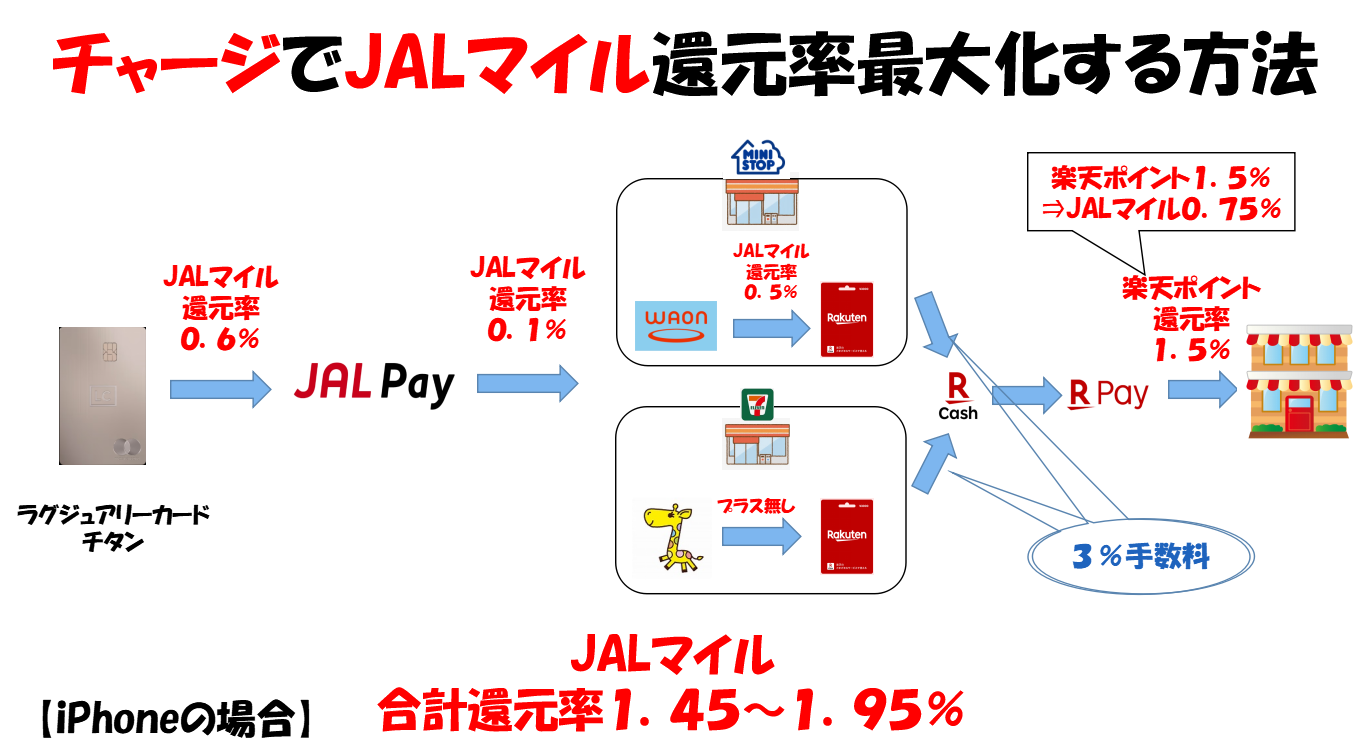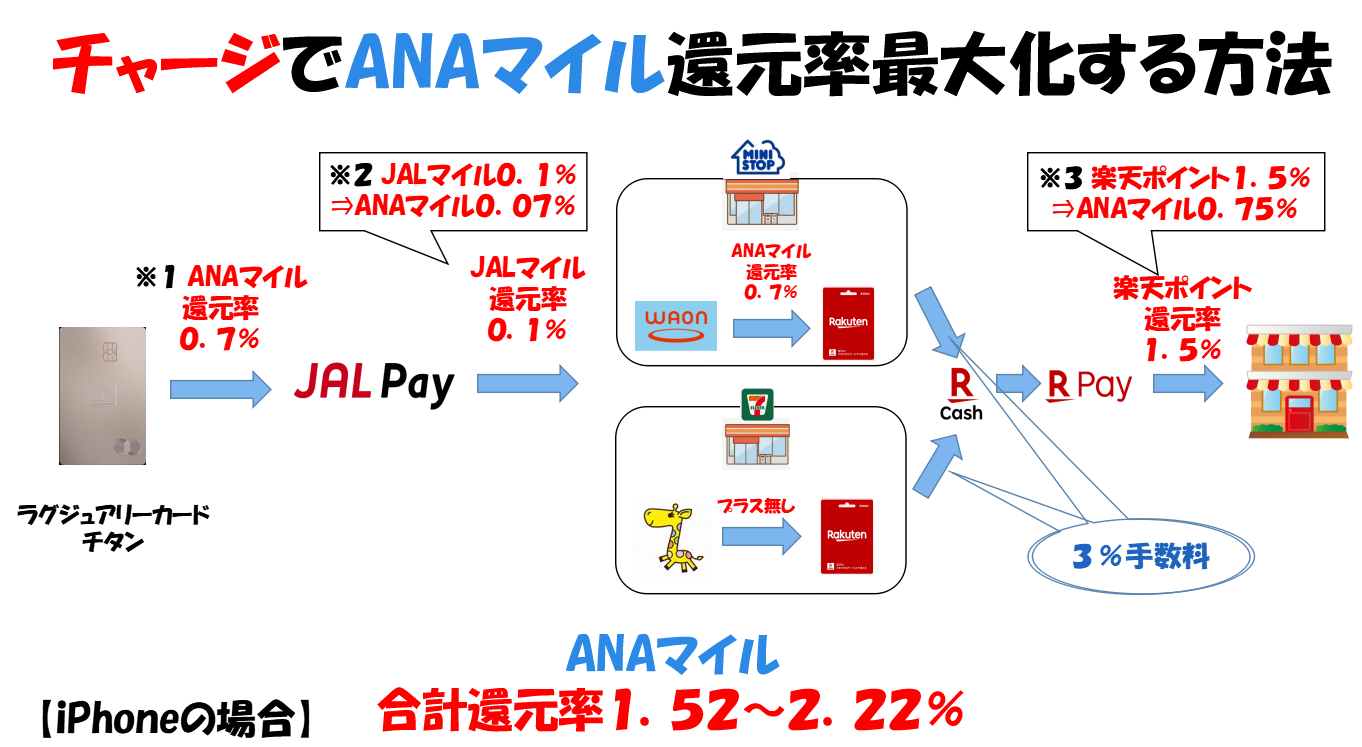 こちらは、iphone端末だけで完結するチャージによるマイル還元率アップ方法です。