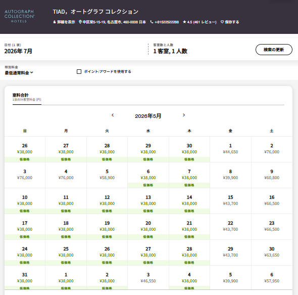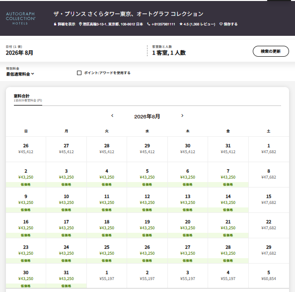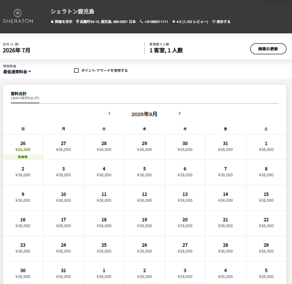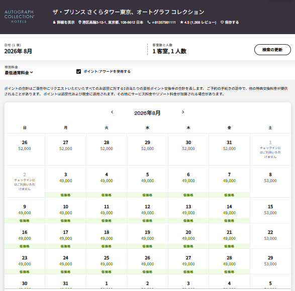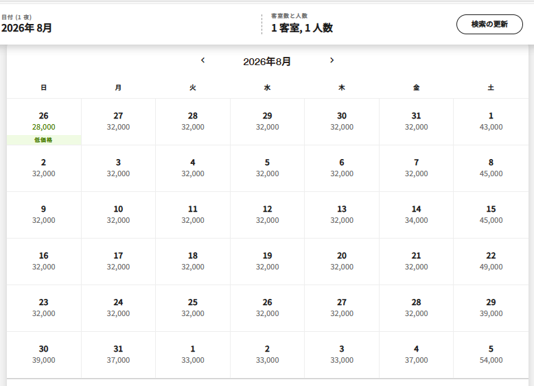 例えば、コチラ2026年8月中に1泊32000pで利用できる日が複数ありました。