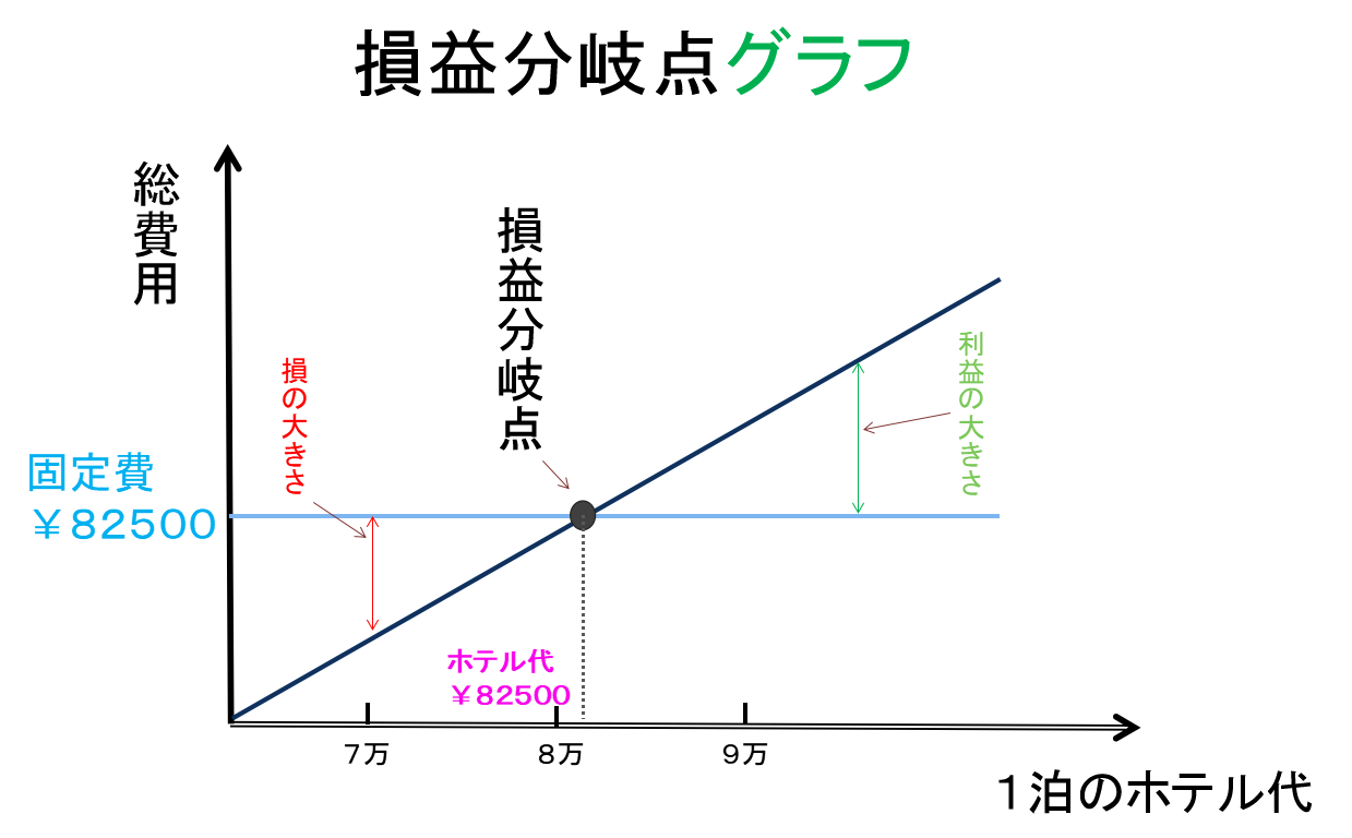 「マリオットボンヴォイアメックスプレミアム」の損益分岐点を考えた場合、固定費は年会費だけですので、グラフにすると下のようになります。