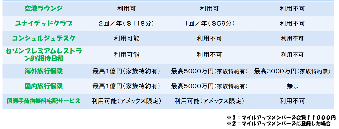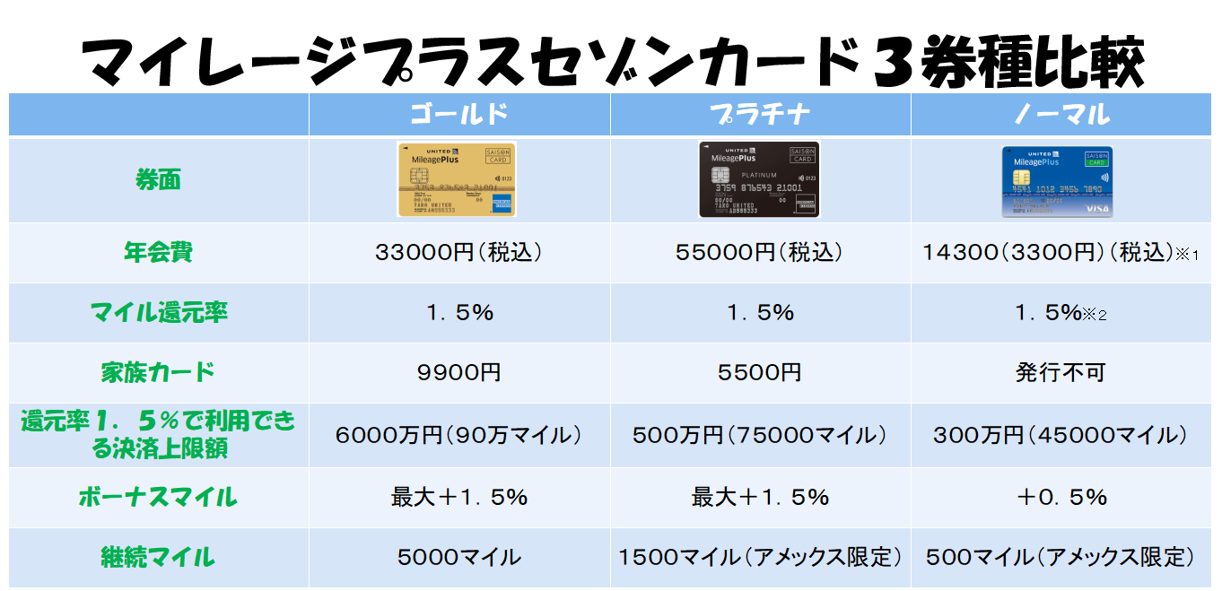 マイレージプラスセゾンカード(ゴールド・プラチナ・ノーマル)比較一覧概要