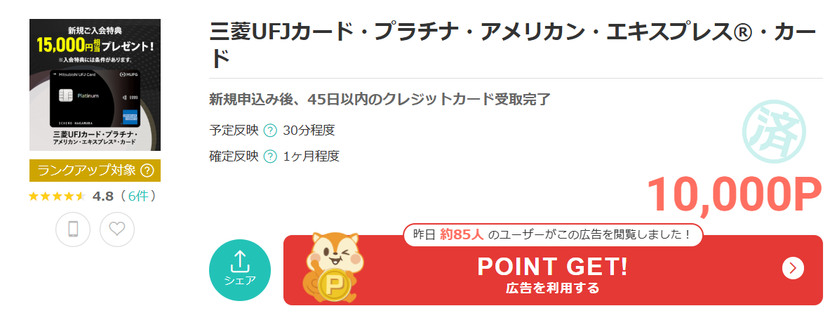 ポイントサイト「モッピー内で「MUFJプラチナアメックス」を検索し、カードを発行すると、