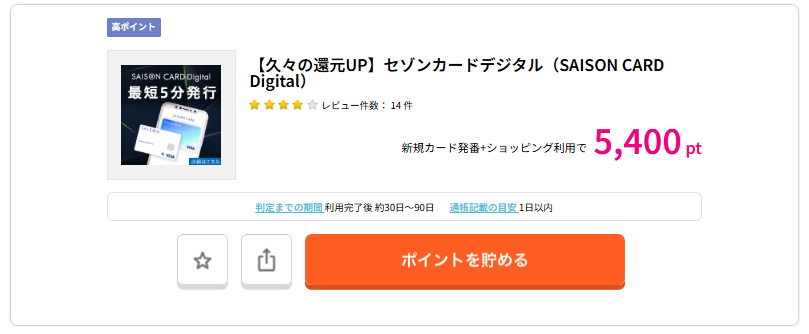 ポイントサイト内で「セゾンカードデジタル」と検索すると、上の図のように画面が表示されます。