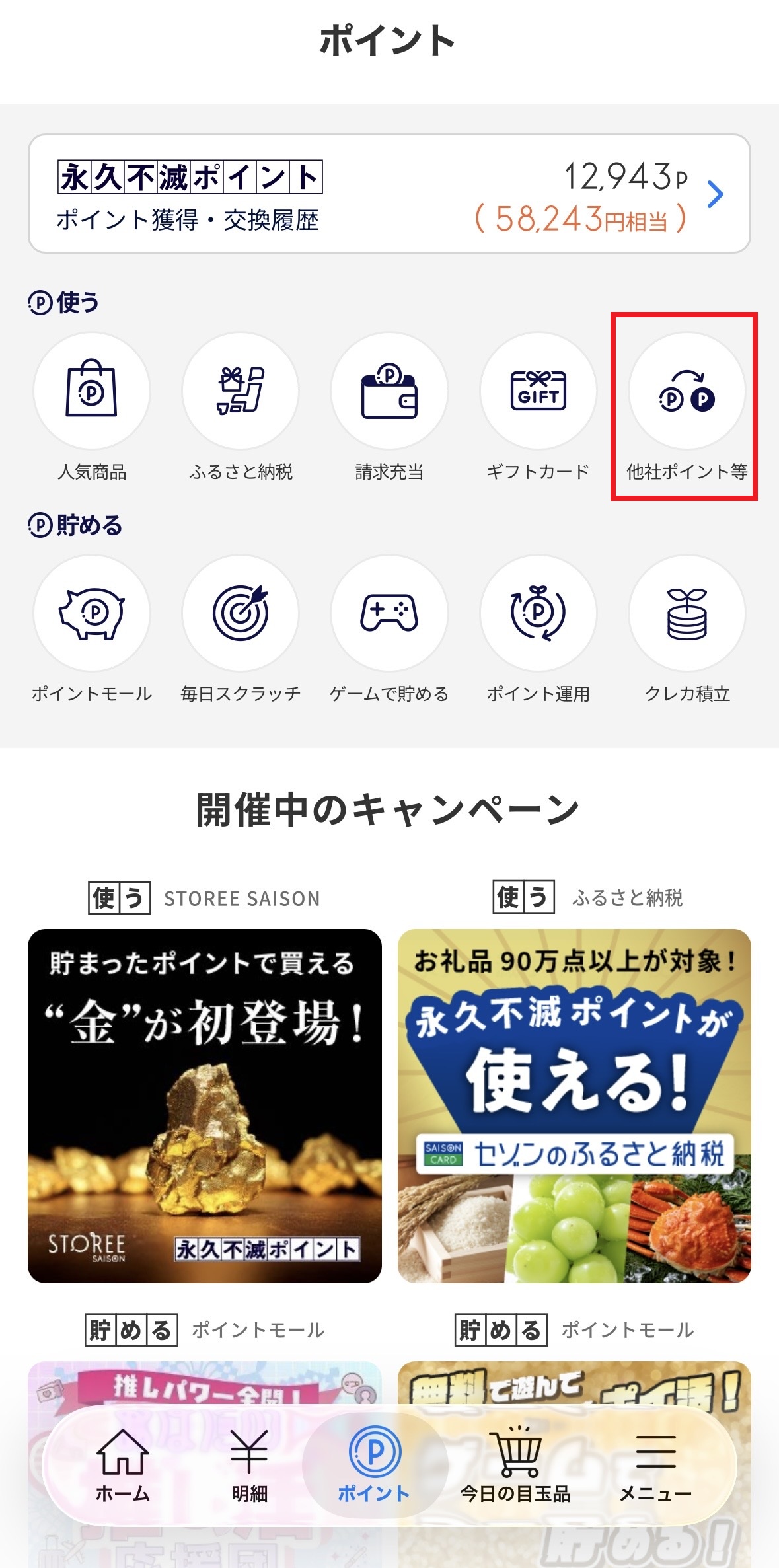 つぎに、画面の上に出てくる「ポイント交換」をタップします。