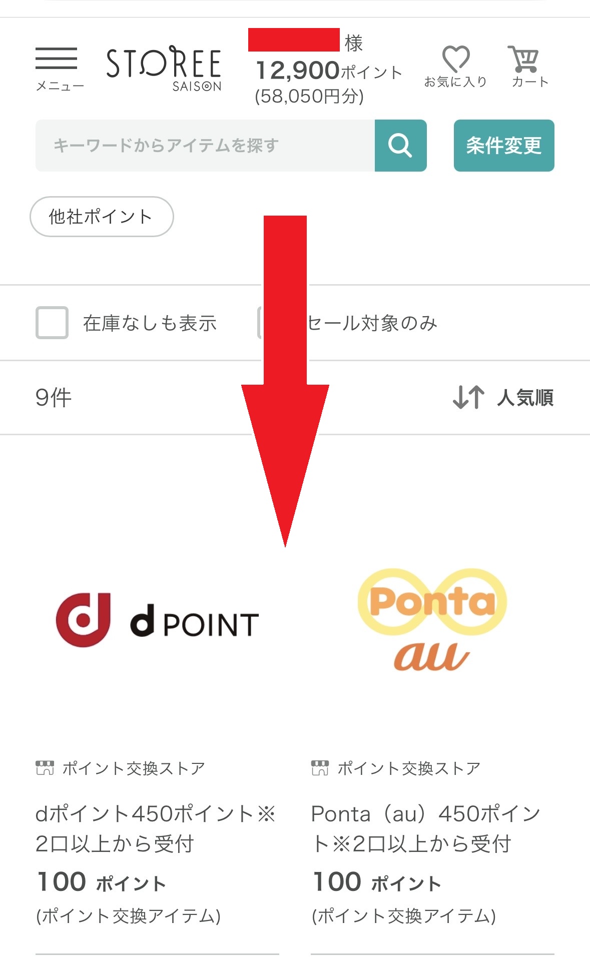この画面の所有するポイントの横にある矢印の部分をタップすると、下のように切り替わります。