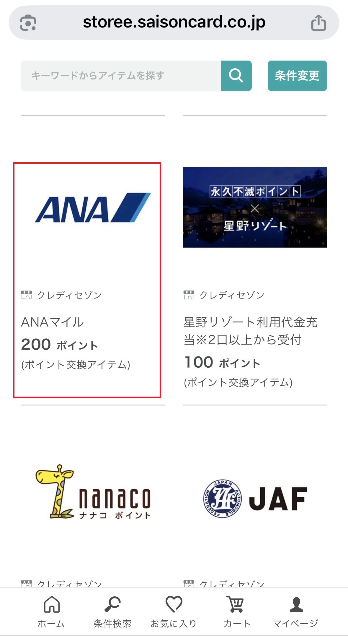 すると、「カード限定アイテム」の欄に「ANA」のロゴが見えてきます。