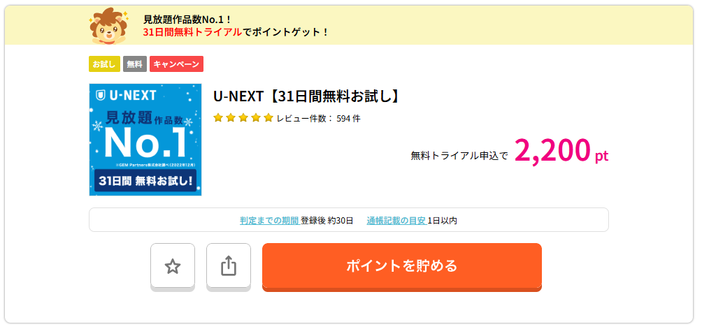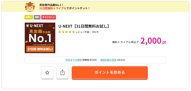 ポイントサイトにおける「UーNEXT」登録時に獲得できるポイント数は、