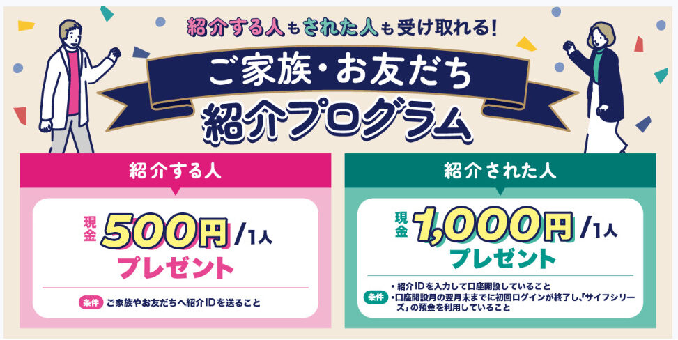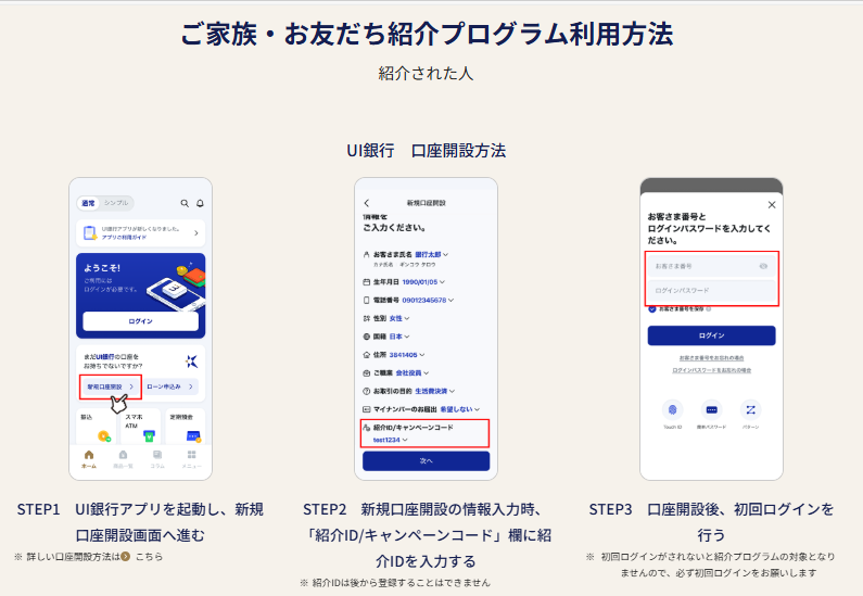 また、「UI銀行」では既存会員から紹介コードを貰って口座開設をすると、