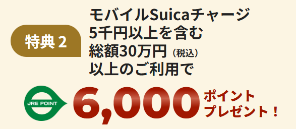 モバイルSuicaへの5000円以上のチャージを含む、合計30万円以上のカード利用で、