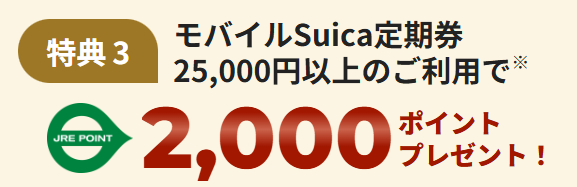 ただし、モバイルSuicaでの定期券購入と同時に行うチャージは、本特典5000円以上の判定額の対象外となりますので注意ください。